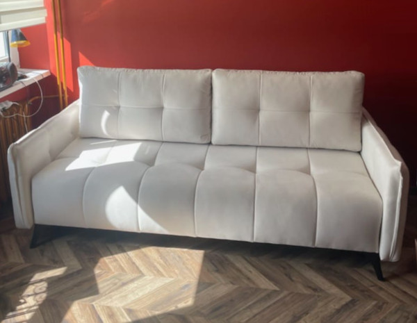 Kremowa rozkładana sofa Dancan OLGA z funkcją spania i pojemnikiem na pościel w tkaninie typu boucle