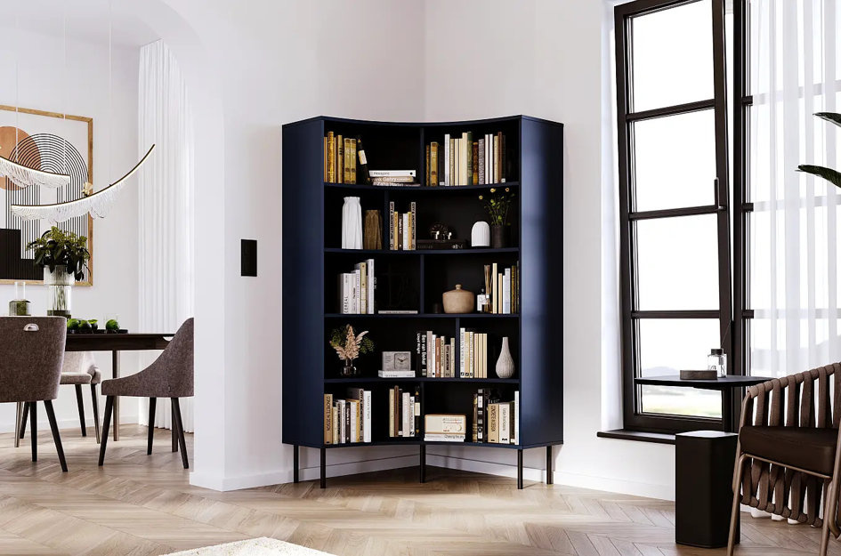Nowoczesny narożny regał na książki Skandica HORN z czarnymi nogami / granatowy / szer. 100 cm