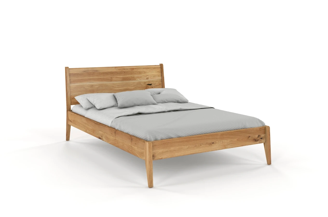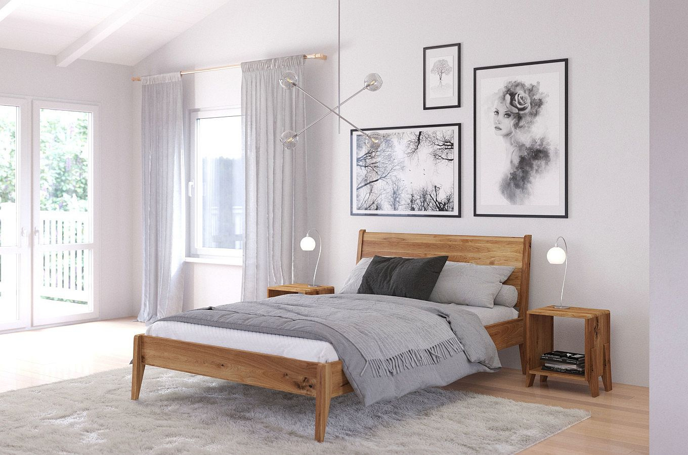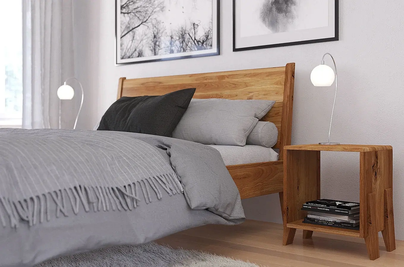 To nowoczesne i oszczędne w formie drewniane łóżko do sypialni, które zdecydowanie wyróżnia się na tle innych, drewnianych łóżek. Posiada ono drewniany zagłówek, który w zestawieniu z podpierającymi go wspornikami, które są jednocześnie jego krawędziami, tworzy bardzo ciekawą formę. Te właściwości w zestawieniu ukośnie uciętymi nogami sprawiają, że mebel wygląda bardzo lekko i dynamicznie. Łóżko to na pewno spodoba się osobom lubiącym nowoczesny styl.