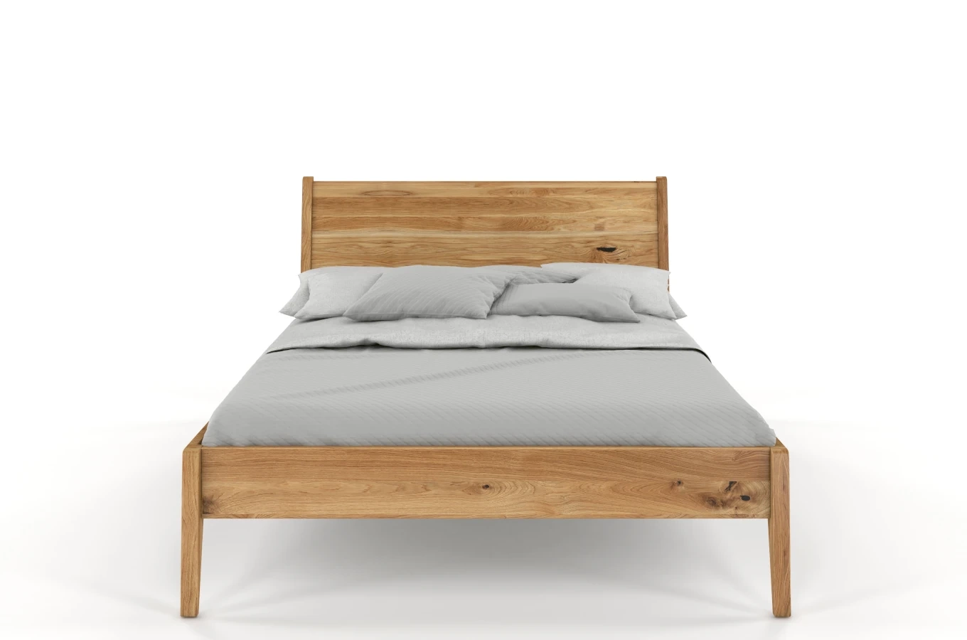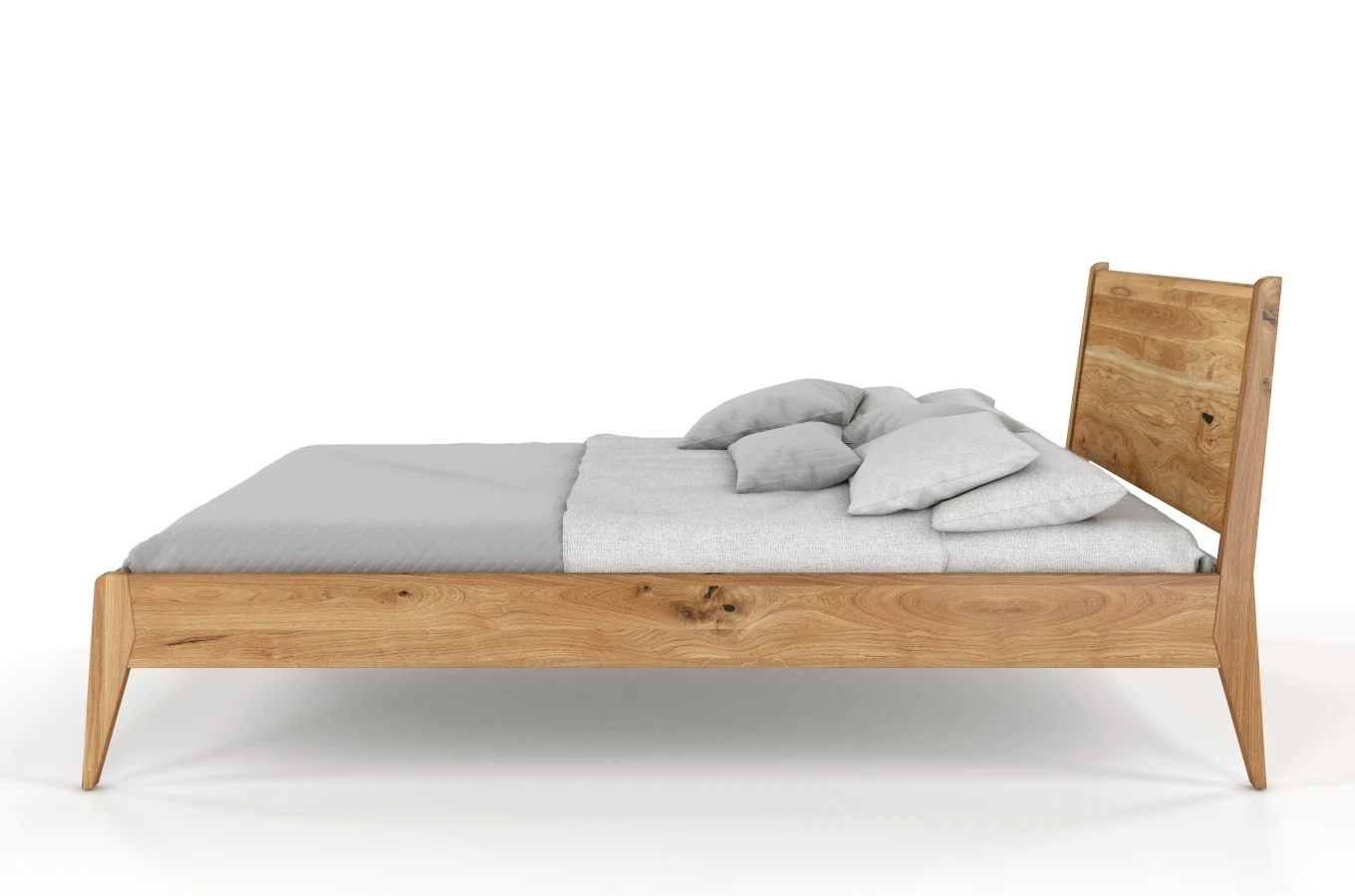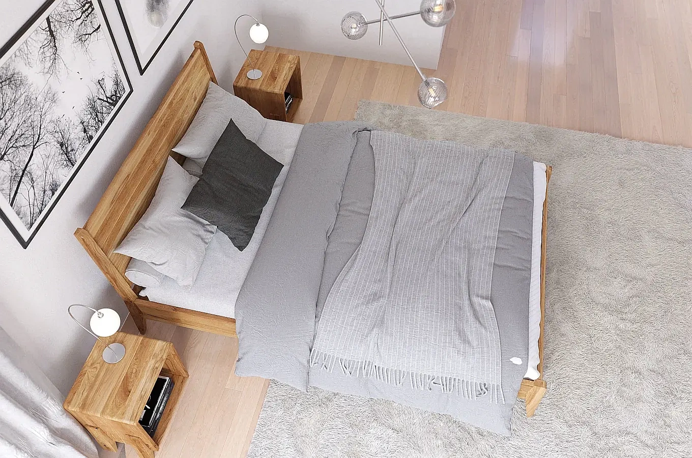 To nowoczesne i oszczędne w formie drewniane łóżko do sypialni, które zdecydowanie wyróżnia się na tle innych, drewnianych łóżek. Posiada ono drewniany zagłówek, który w zestawieniu z podpierającymi go wspornikami, które są jednocześnie jego krawędziami, tworzy bardzo ciekawą formę. Te właściwości w zestawieniu ukośnie uciętymi nogami sprawiają, że mebel wygląda bardzo lekko i dynamicznie. Łóżko to na pewno spodoba się osobom lubiącym nowoczesny styl.