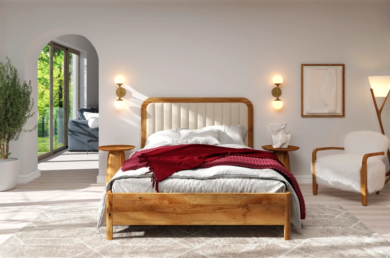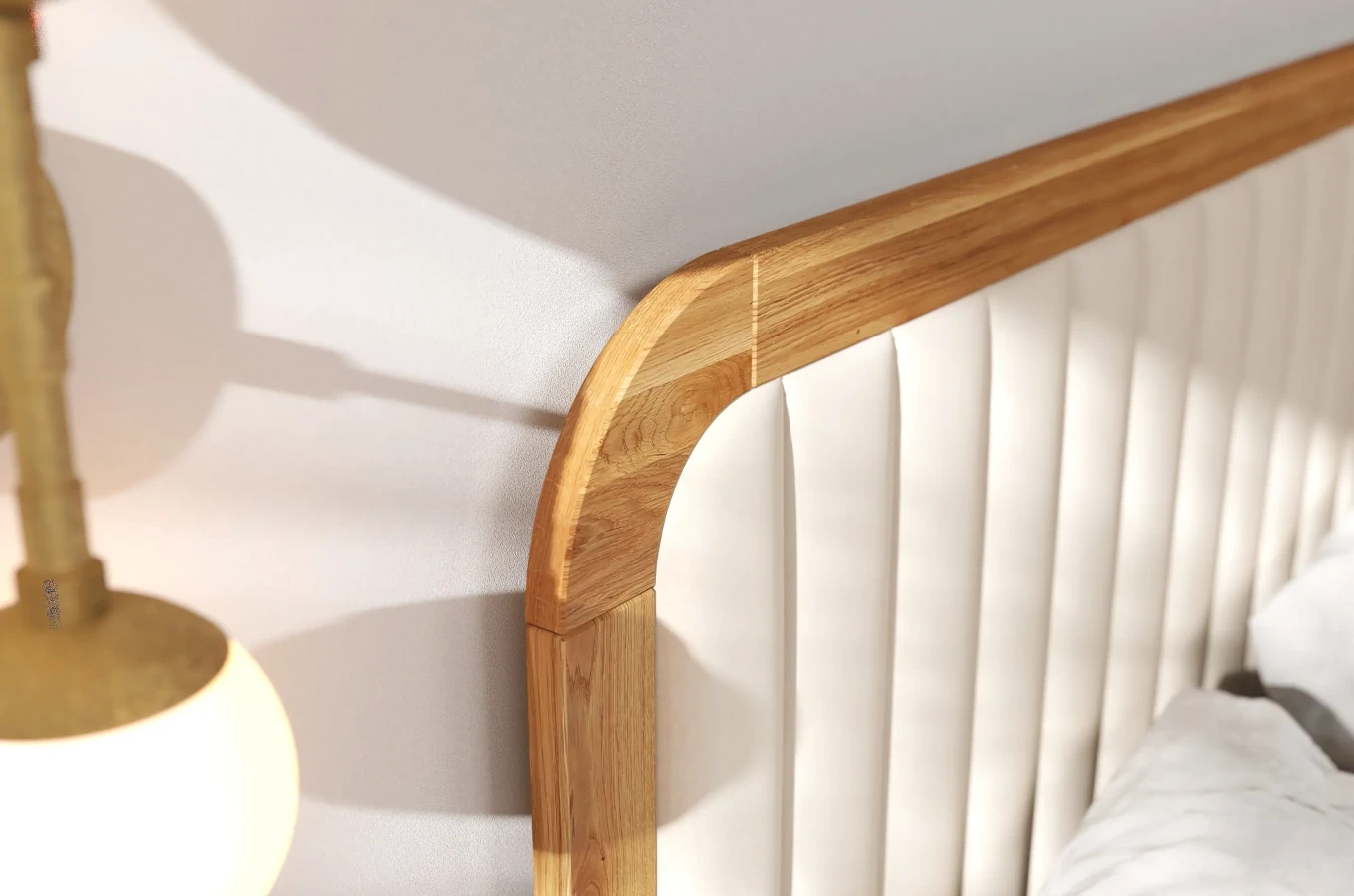 Elementem wyróżniającym prezentowany model jest wysoki, tapicerowany zagłówek z pionowymi przeszyciami, otoczony drewnianą ramą o zaokrąglonych krawędziach. Zaokrąglone są również wysokie nogi łóżka. Brak ostrych kantów sprawia, że łóżko jest bezpieczne w użytkowaniu oraz wyróżnia się na tle innych modeli. Co więcej, odpowiednia wysokość nóg ułatwi sprzątanie - pod łóżkiem zmieści się robot sprzątający!