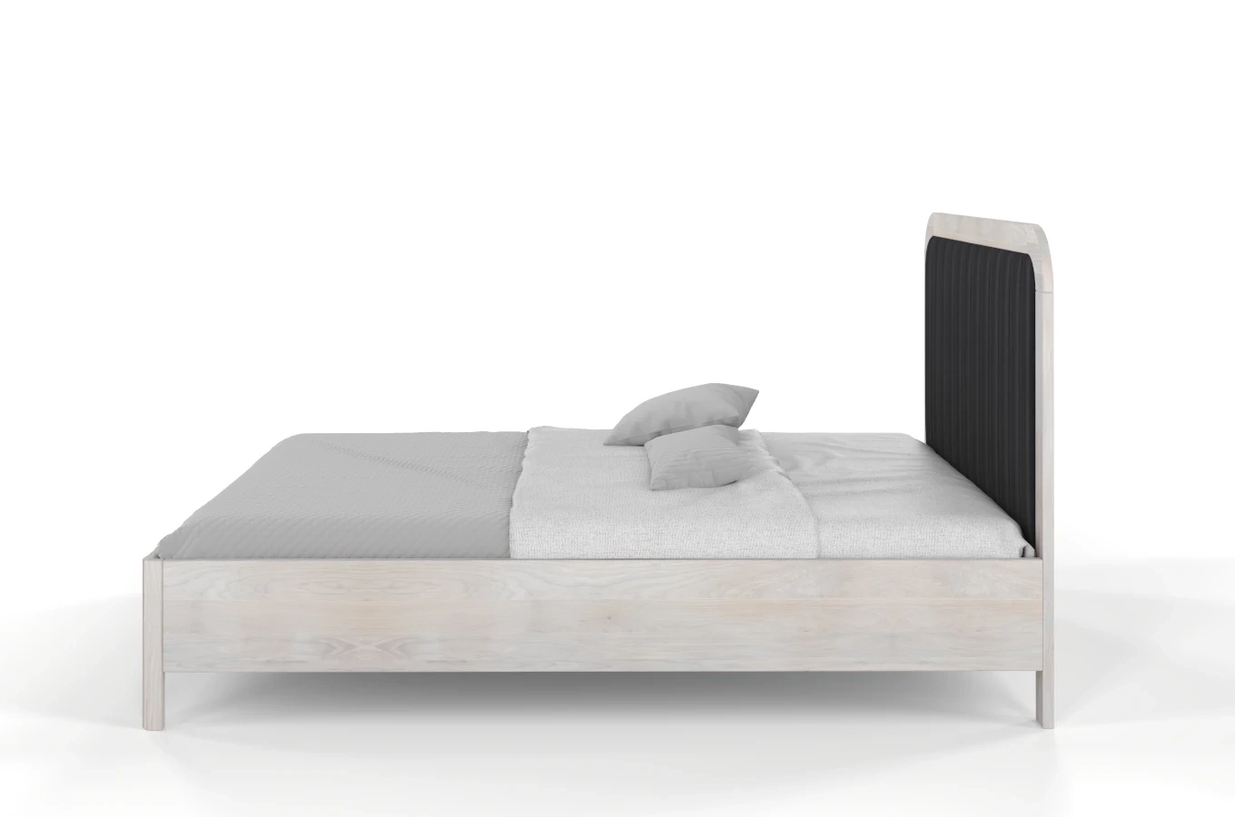 Drewniane łóżko z tapicerowanym zagłówkiem i zaokrąglonych brzegach