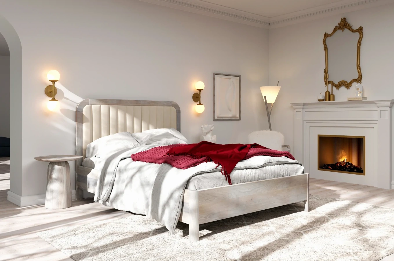 Drewniane łóżko do sypialni z tapicerowanym zagłówkiem