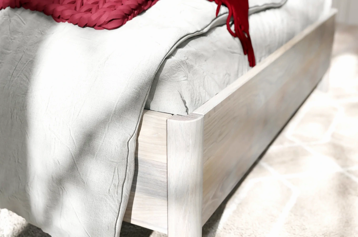 Elementem wyróżniającym prezentowany model jest wysoki, tapicerowany zagłówek z pionowymi przeszyciami, otoczony drewnianą ramą o zaokrąglonych krawędziach. Zaokrąglone są również wysokie nogi łóżka. Brak ostrych kantów sprawia, że łóżko jest bezpieczne w użytkowaniu oraz wyróżnia się na tle innych modeli. Co więcej, odpowiednia wysokość nóg ułatwi sprzątanie - pod łóżkiem zmieści się robot sprzątający!