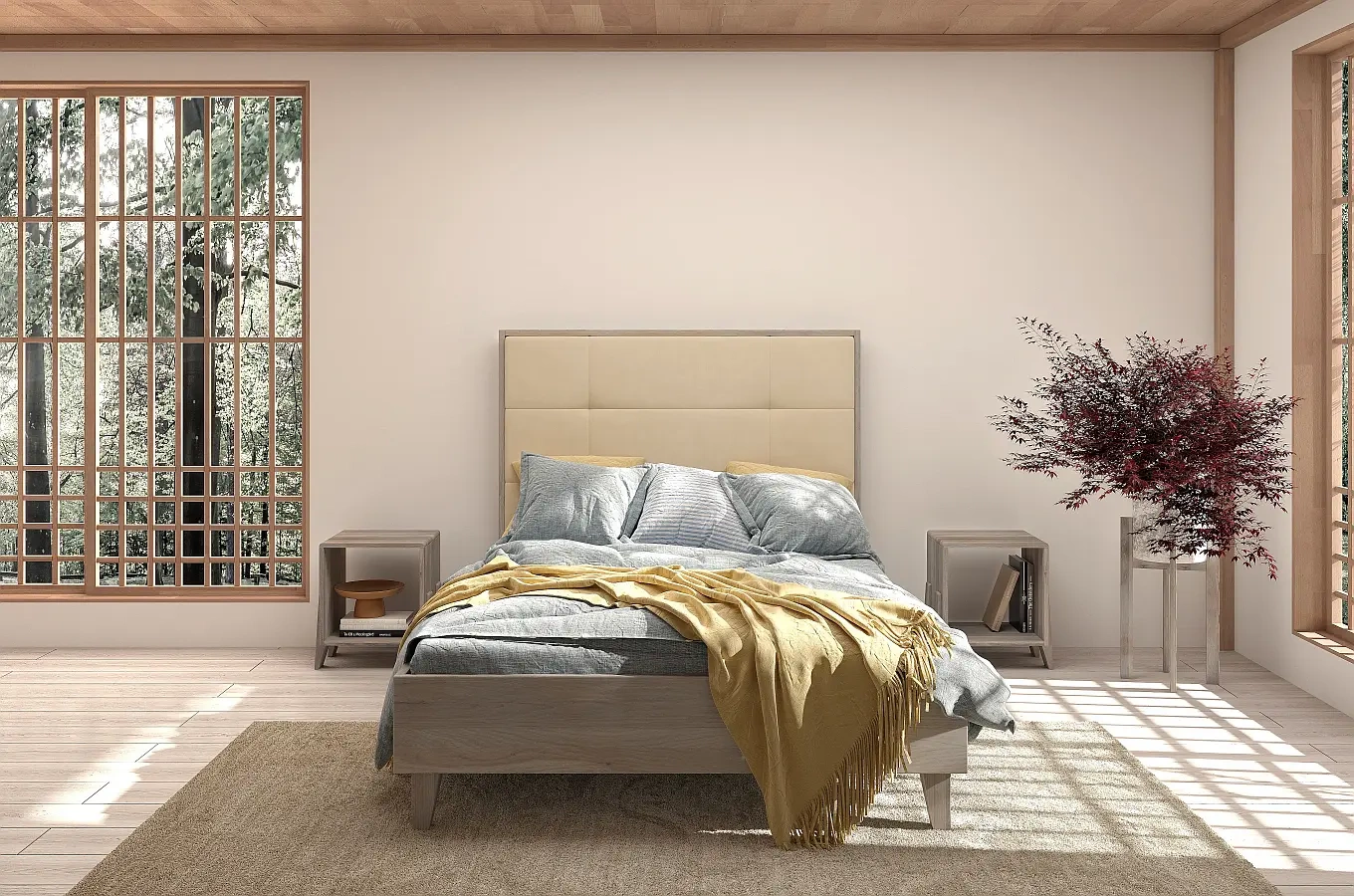 Drewniane łóżko do sypialni z tapicerowanym zagłówkiem