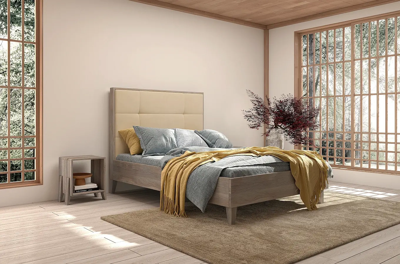 Drewniane łóżko z tapicerowanym zagłówkiem