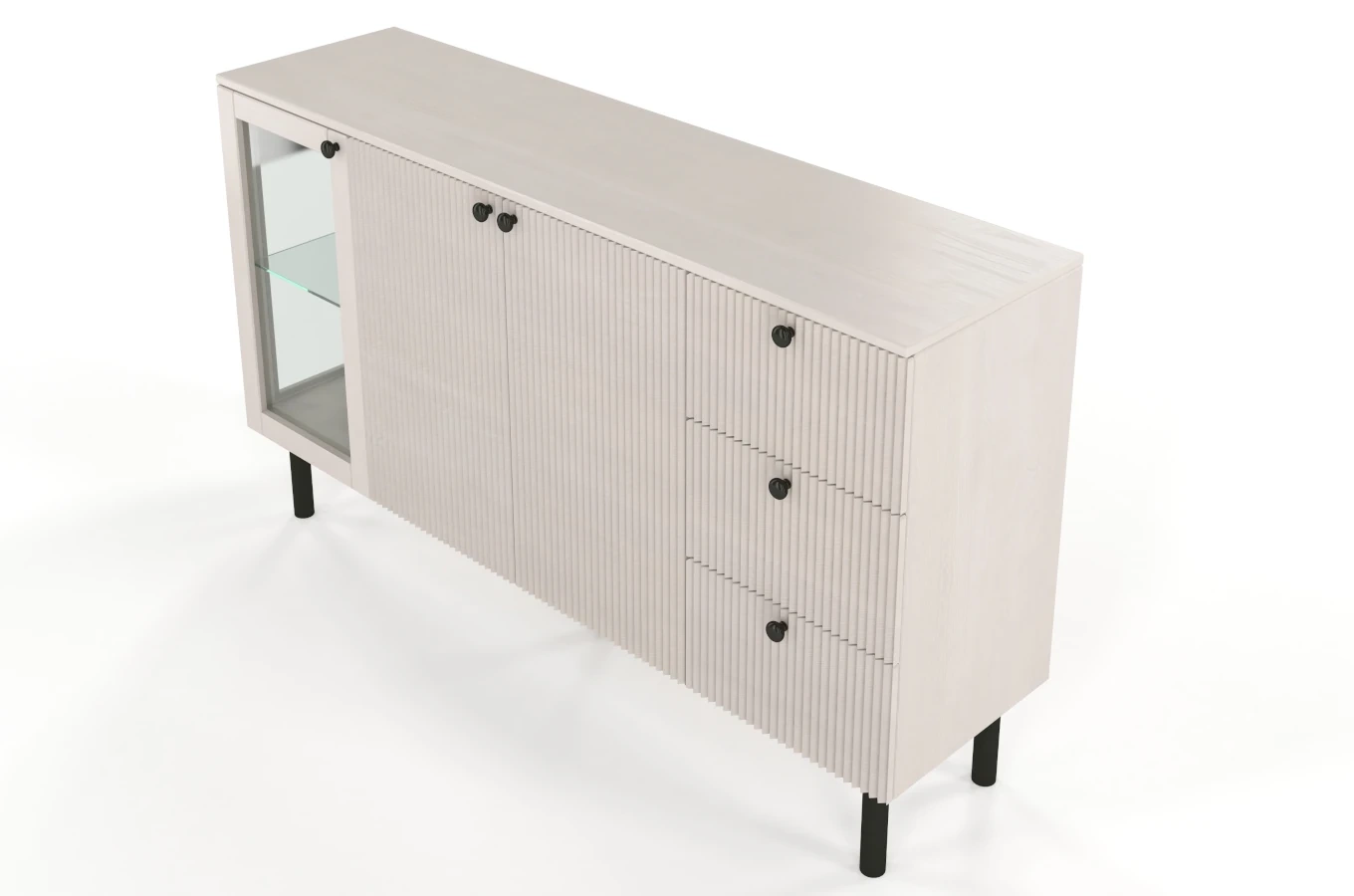 Elegancki, a zarazem funkcjonalny mebel, który sprawdzi się zarówno w salonie, gabinecie, jak i jadalni. Z jego lewej strony znajduje się szafka z przeszklonym frontem i bokiem - doskonale eksponująca przedmioty ustawione wewnątrz. Środkową część komody stanowi dwudrzwiowa szafka z półką w środku. Prawa strona składa się z 3 szufladek. Fronty drewnianych drzwiczek i szuflad zdobi efektowne pionowe frezowanie, które nadaje całości nowoczesny charakter.
