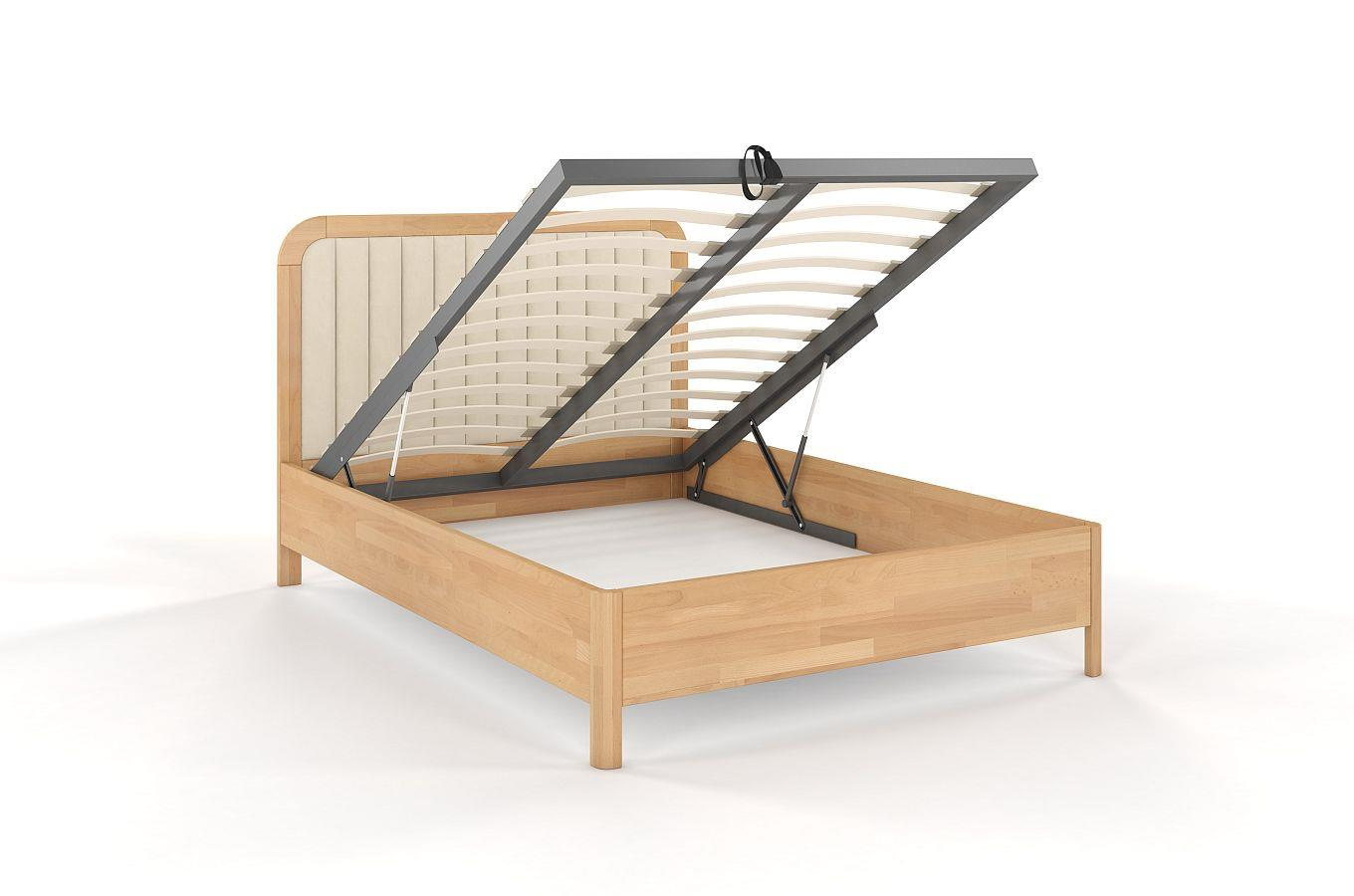 Bukowe łóżko z tapicerowanym zagłówkiem i pojemną skrzynią