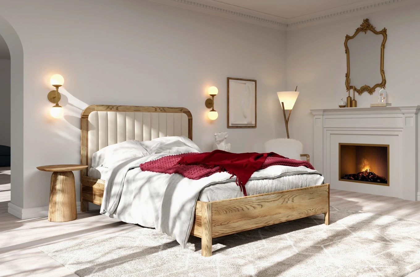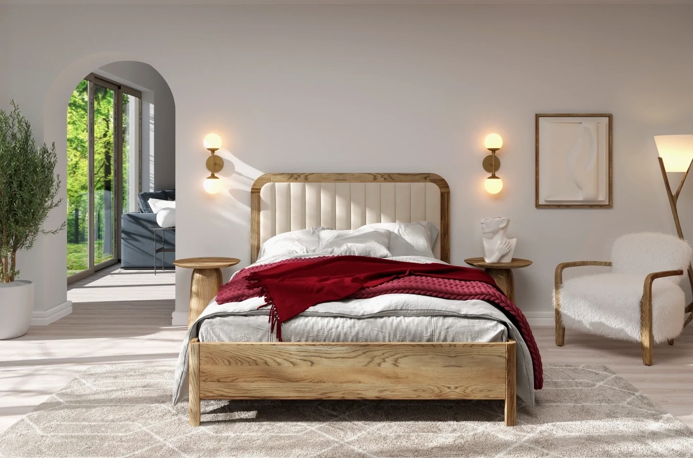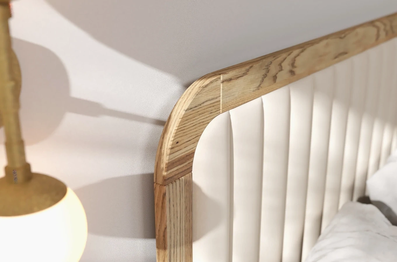 Drewniane łóżko z tapicerowanym zagłówkiem i zaokrąglonych brzegach