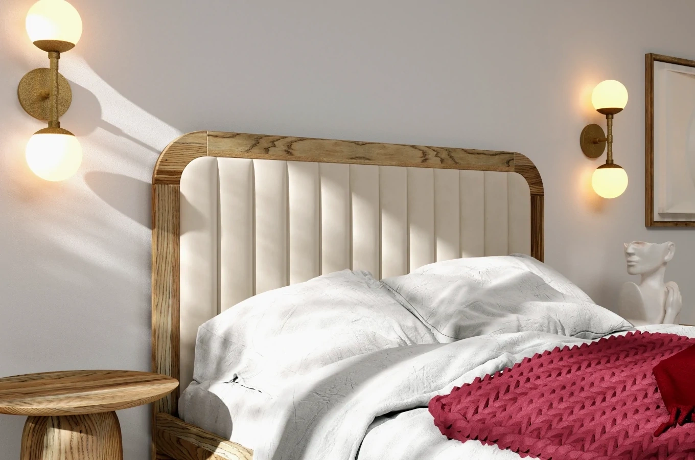 Drewniane łóżko z tapicerowanym zagłówkiem i zaokrąglonych brzegach