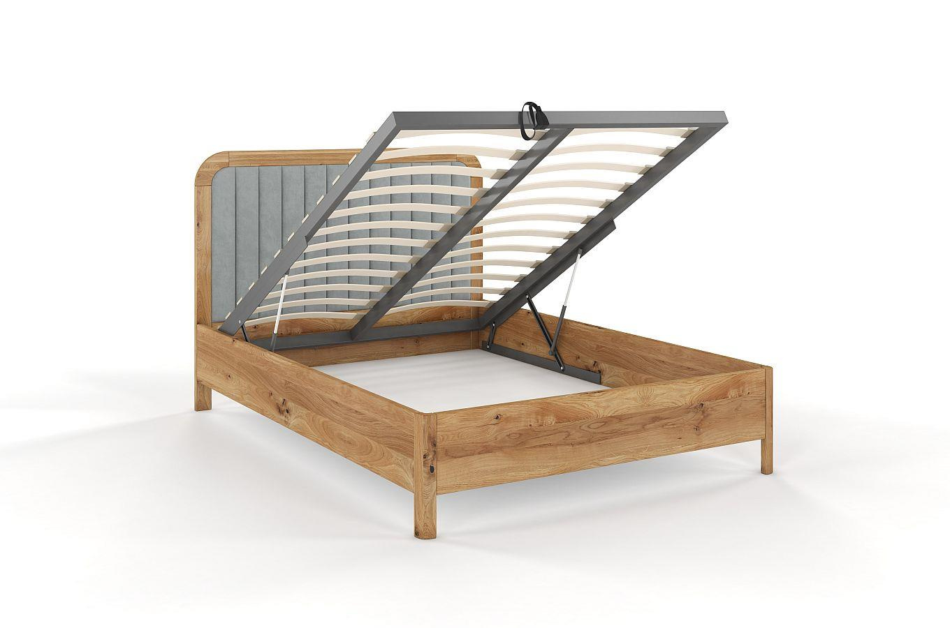 Dębowe łóżko z tapicerowanym zagłówkiem i pojemną skrzynią