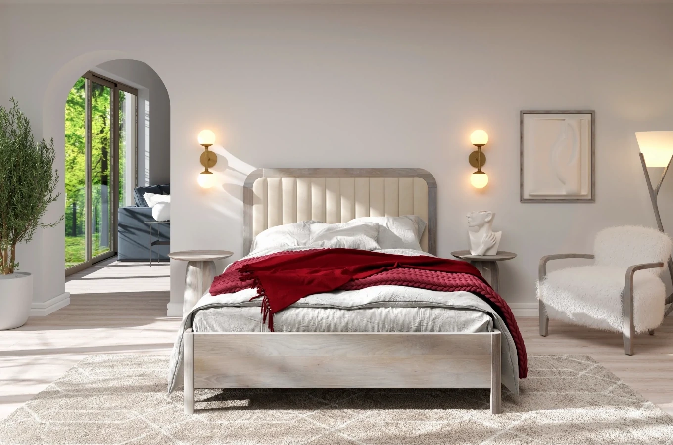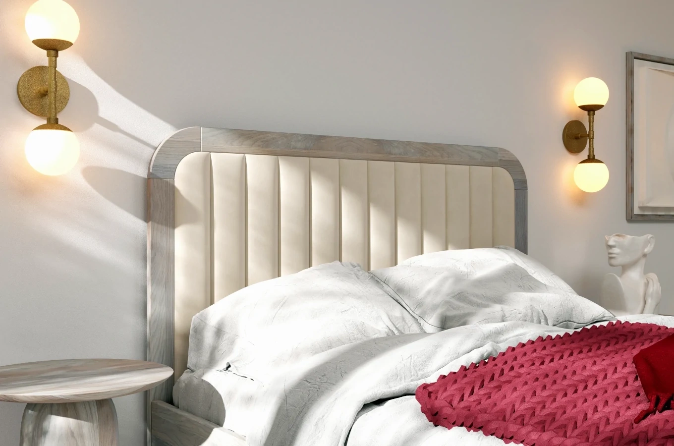 Drewniane łóżko z tapicerowanym zagłówkiem i zaokrąglonych brzegach