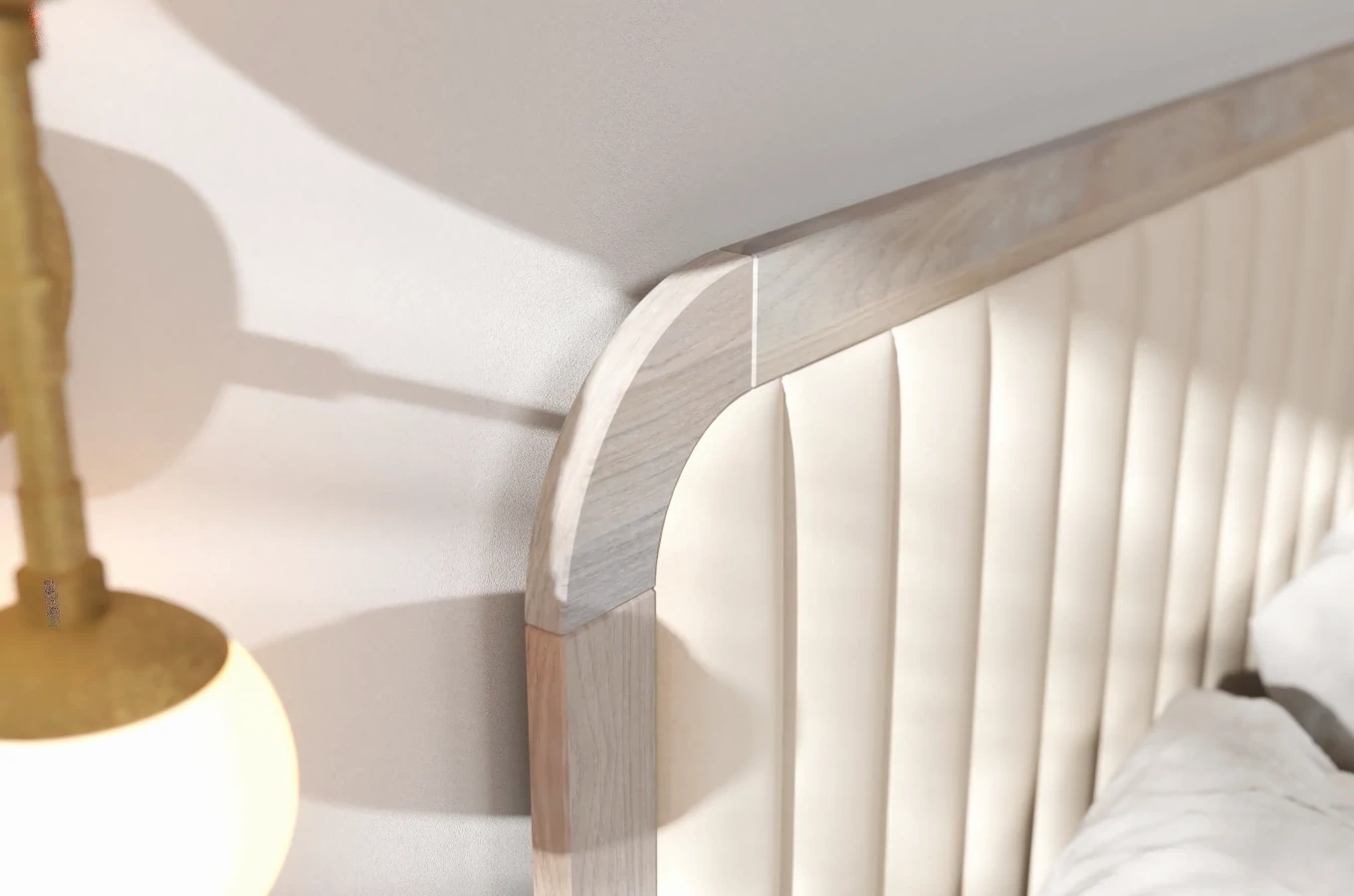 Elementem wyróżniającym to łóżko jest wysoki, tapicerowany zagłówek z pionowymi przeszyciami, otoczony drewnianą ramą o zaokrąglonych krawędziach. Zaokrąglone są również wysokie nogi łóżka. Brak ostrych krawędzi sprawia, że łóżko jest bezpieczne w użytkowaniu i wyróżnia się na tle innych modeli. Dodatkowym atutem jest praktyczna skrzynia na pościel, którą otwiera się lekko dzięki zastosowanym siłownikom gazowym oraz specjalnej taśmie zamocowanej wokół ramy skrzyni.