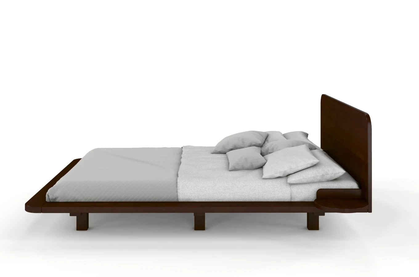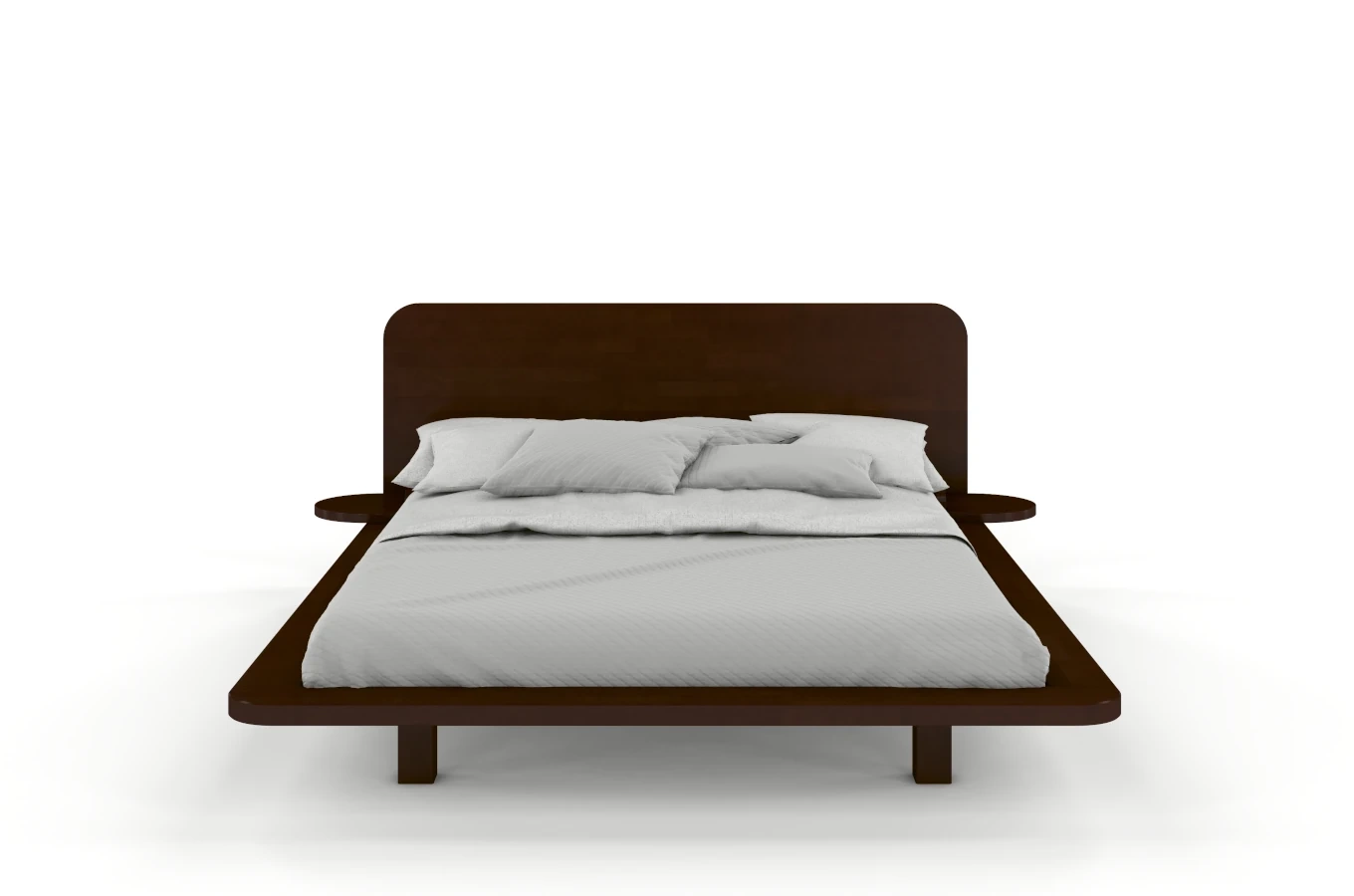 Łóżko Skandica JAPANDIC w całości wykonane zostało z pięknego i trwałego drewna bukowego w oszczędnej, a zarazem ciekawej formie. Oryginalna konstrukcja opiera się o grubą (4 cm) drewnianą ramę, która jednocześnie tworzy swego rodzaju szeroką półkę wokół materaca. Zaokrąglone krawędzie zarówno zagłówka, jak i ramy łóżka nadają bryle wizualnej lekkości, a także wpływają na bezpieczeństwo użytkowania. Rama łóżka opiera się na solidnych deskach, których fundamentem jest 6 stabilnych drewnianych nóg. Warto zauważyć, że nogi są znacznie cofnięte w stosunku do krawędzi mebla, dzięki czemu uzyskujemy efekt łóżka "lewitującego". Ponadto, mocnym atutem mebla są oparte na jego ramie stoliki nocne w postaci okrągłych półek. Stanowią one idealne miejsce na ulubioną lekturę, lampkę nocną oraz inne rzeczy przydatne w zasięgu ręki na czas snu. Opcjonalnie istnieje możliwość zamówienia prezentowanego łóżka w wersji bez stolików.