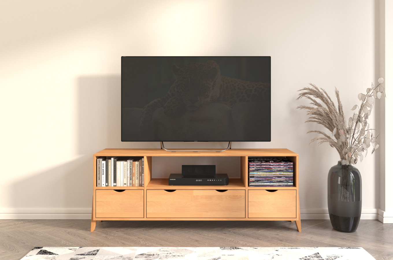 Szafka RTV Visby GDYNIA została wykonana z litego drewna bukowego łączonego na mikrowczepy. To oznacza, że nie zastosowaliśmy żadnych zamienników, ale solidne naturalne drewno, które gwarantuje solidność na długie lata.