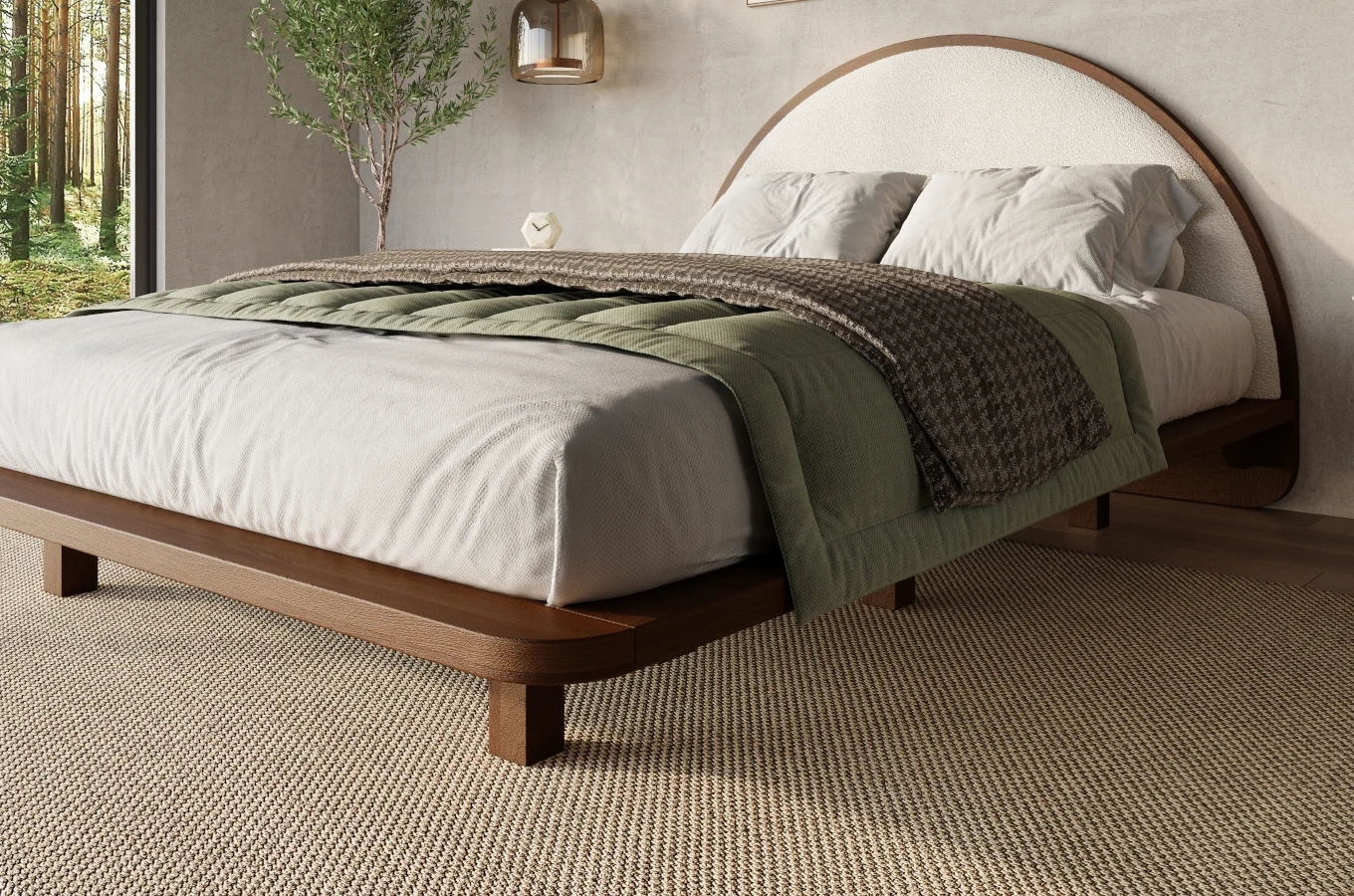 Wyobraź sobie, jak wygodnie opierasz się o miękki, owalny zagłówek wykończony przyjemną w dotyku tkaniną boucle – idealne tło dla wieczornego relaksu z książką czy porannej kawy w łóżku. Szeroka rama nie tylko podkreśli nowoczesny styl Twojej sypialni, ale posłuży też jako praktyczna półka – wszystko, czego potrzebujesz, masz zawsze pod ręką.