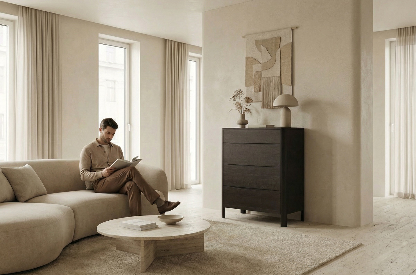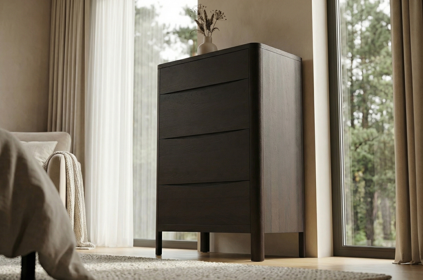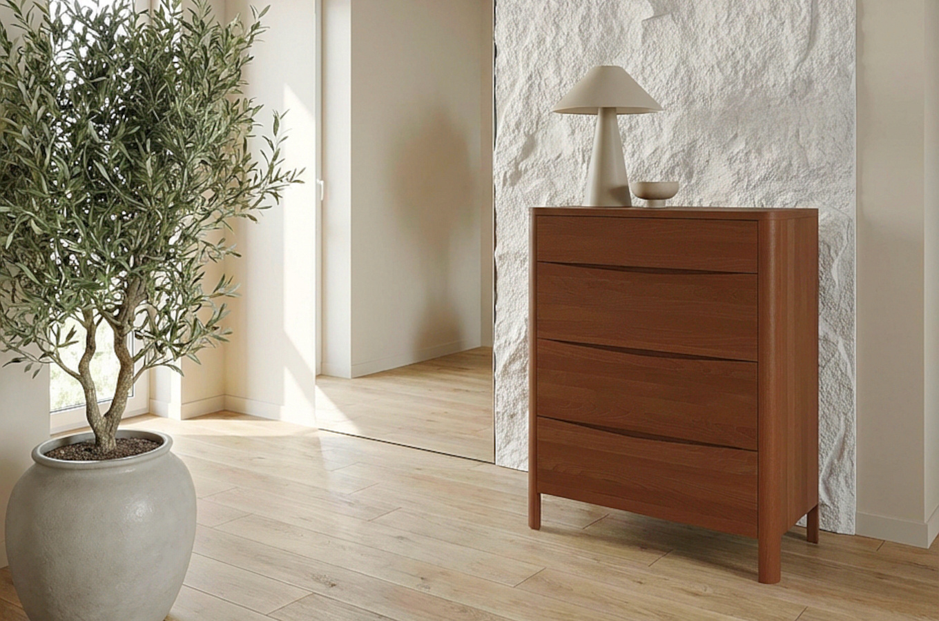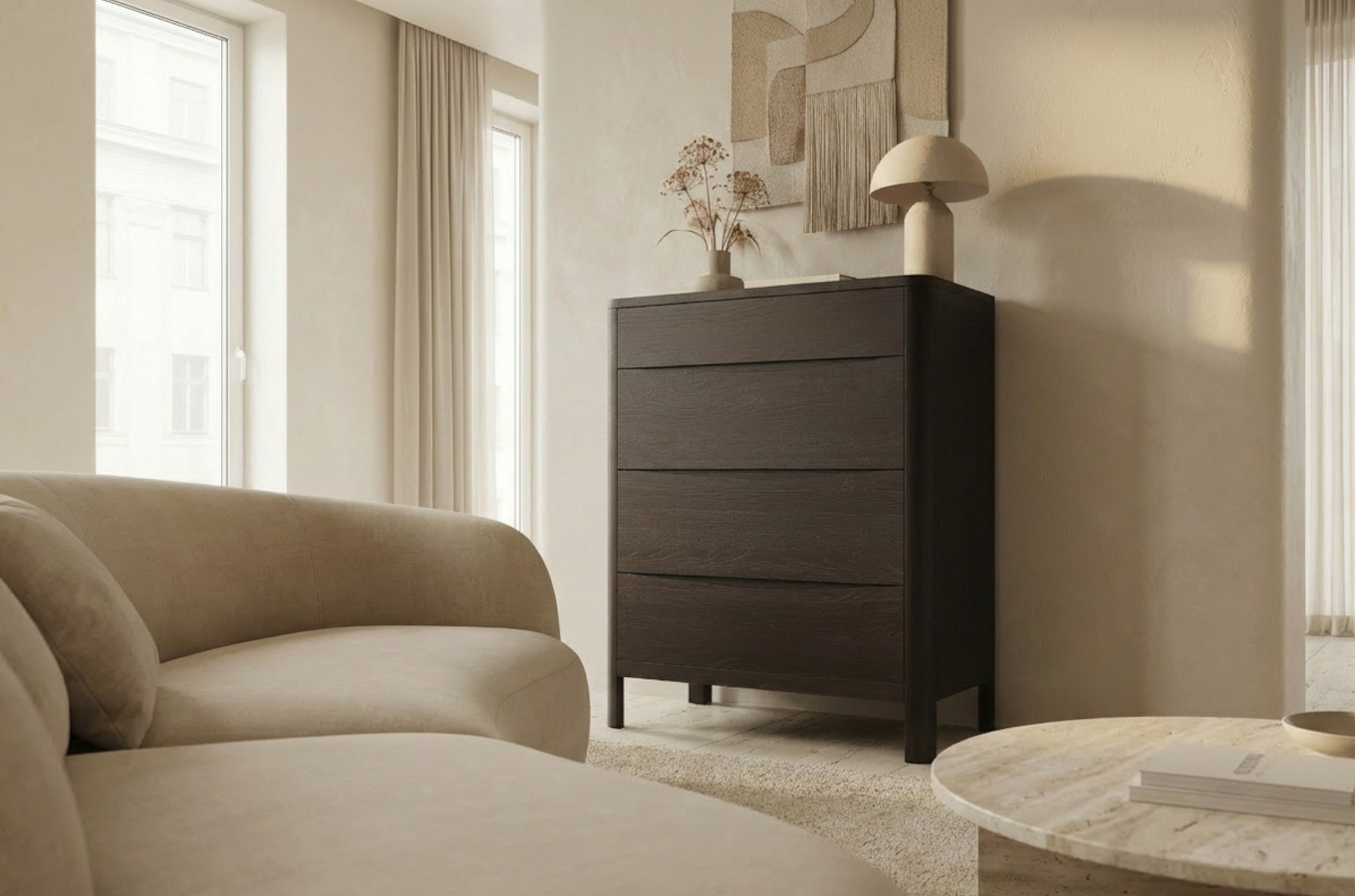 Drewniana komoda bukowa Visby MODENA 80 to mebel, który doskonale łączy estetykę z funkcjonalnością, udowadniając, że prawdziwe piękno tkwi w prostocie. Jej starannie dopracowany design zachwyca subtelnie zaokrąglonymi narożnikami oraz wyjątkowym frezowaniem na frontach – trójkątna rynna, biegnąca przez całą szerokość szuflady, pełni funkcję wygodnego uchwytu, będąc jednocześnie oryginalnym akcentem dekoracyjnym. Cztery pojemne szuflady, wyposażone w prowadnice z systemem cichego domyku i hamulcem, gwarantują wysoki komfort użytkowania, cichą pracę i bezpieczne zamykanie – idealne rozwiązanie do sypialni, salonu czy gabinetu.