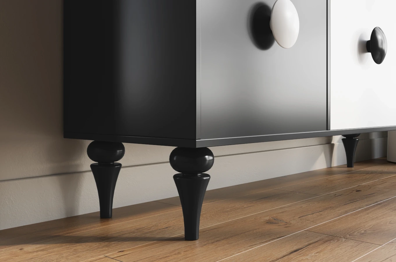 Nowoczesna czarno-biała komoda Dancan PARADIS została wykonana z solidnej płyty meblowej o grubości 16 mm, co zapewnia jej stabilność i odporność na uszkodzenia. Toczone, malowane drewniane uchwyty i nogi dodają jej elegancji, a jednocześnie ułatwiają codzienne użytkowanie. Co więcej, wysokie nóżki to cichy sprzymierzeniec czystości – bez trudu pod komodę wjedzie robot sprzątający, a tradycyjne odkurzanie czy mycie podłogi staje się banalnie proste. Widoczne przegrody między frontami podkreślają geometryczny charakter bryły i wprowadzają porządek nie tylko wizualny, ale i praktyczny. PARADIS to nie tylko mebel – to świadomy wybór dla tych, którzy cenią styl, porządek i funkcjonalność w najlepszym wydaniu.