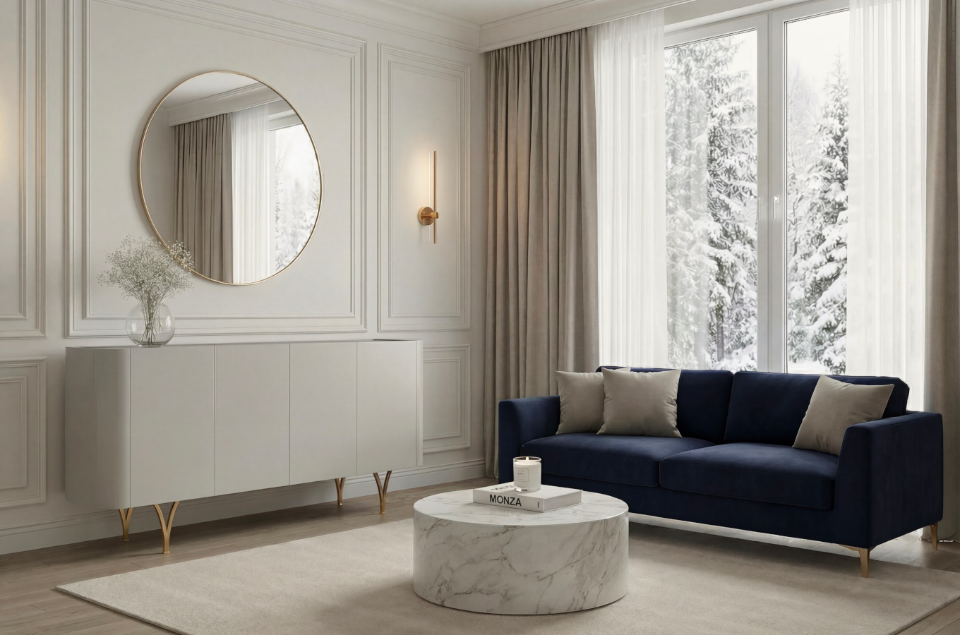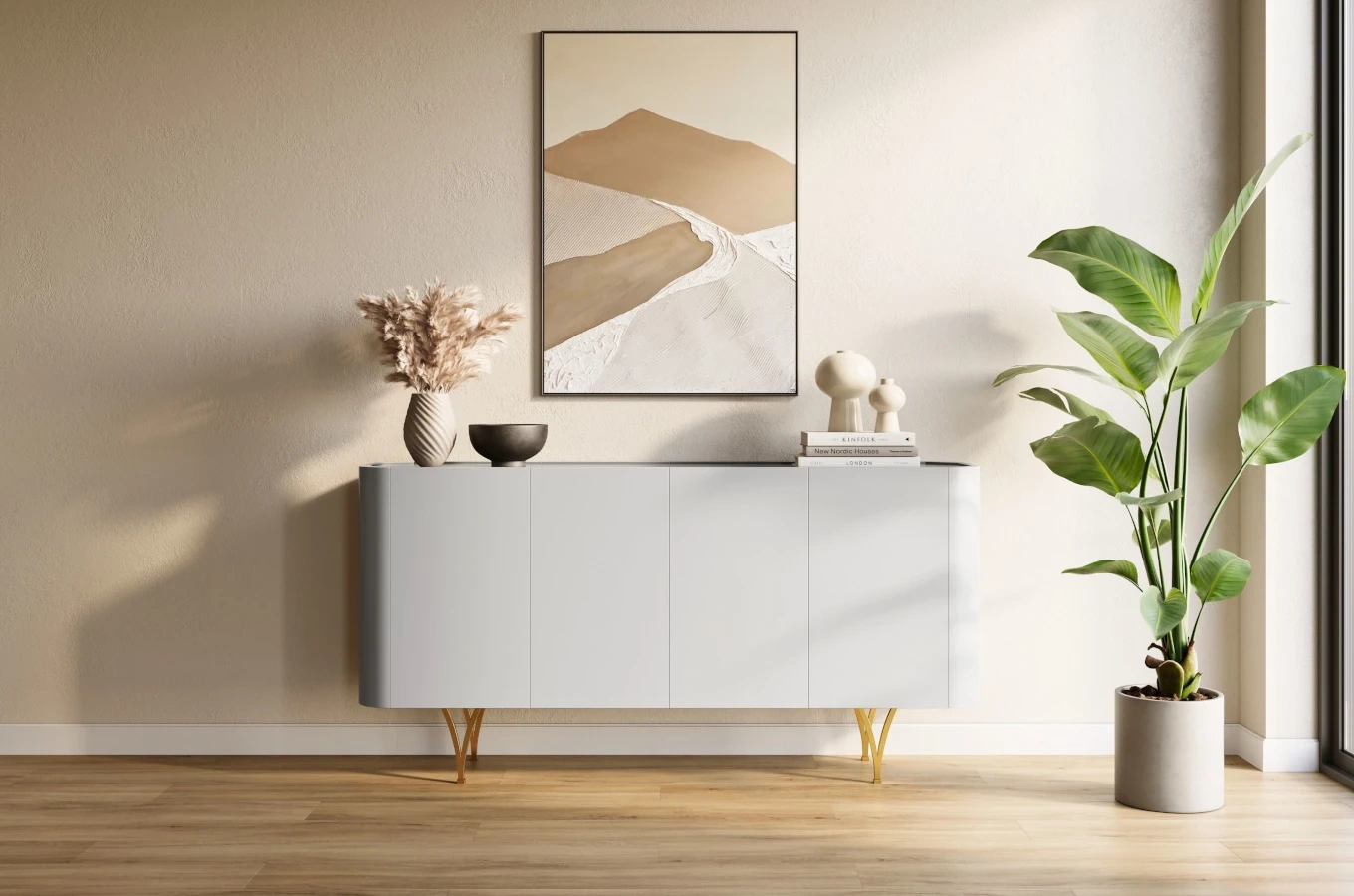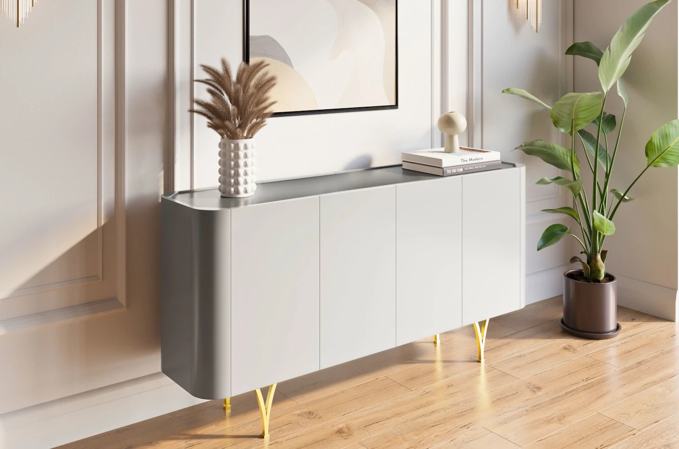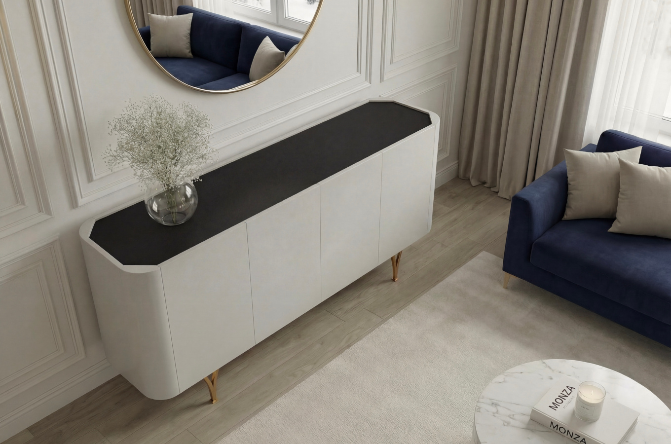 • Dancan MONZA to komoda, która zachwyca detalem i przyciąga spojrzenia. Subtelna forma, złote akcenty i funkcjonalność zamknięte w nowoczesnym stylu.