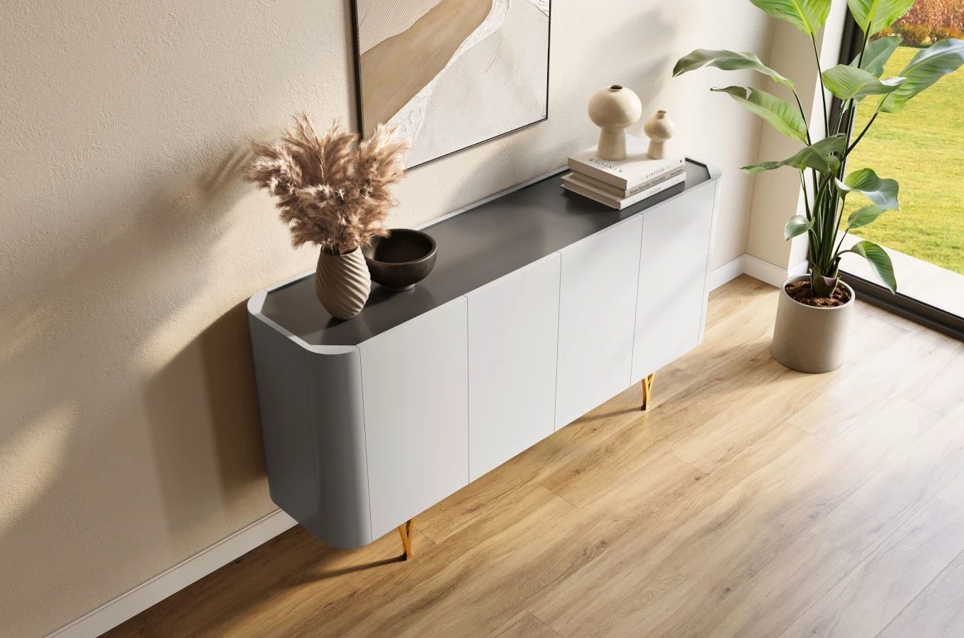 Nowoczesna szara komoda Dancan MONZA to coś więcej niż przechowywanie – to styl, który przyciąga spojrzenia i buduje atmosferę nowoczesnej elegancji. Jej subtelnie zaokrąglone narożniki, brak uchwytów i delikatnie wpuszczony blat tworzą harmonijną, przyjemną dla oka formę, która pasuje zarówno do minimalistycznego loftu, jak i wysmakowanego salonu. Cztery pojemne szafki z regulowanymi półkami pozwolą Ci uporządkować przestrzeń dokładnie tak, jak lubisz. A złote, smukłe nóżki? To biżuteria dla Twojego wnętrza – dodają klasy, lekkości i… nieprzeciętnego charakteru.