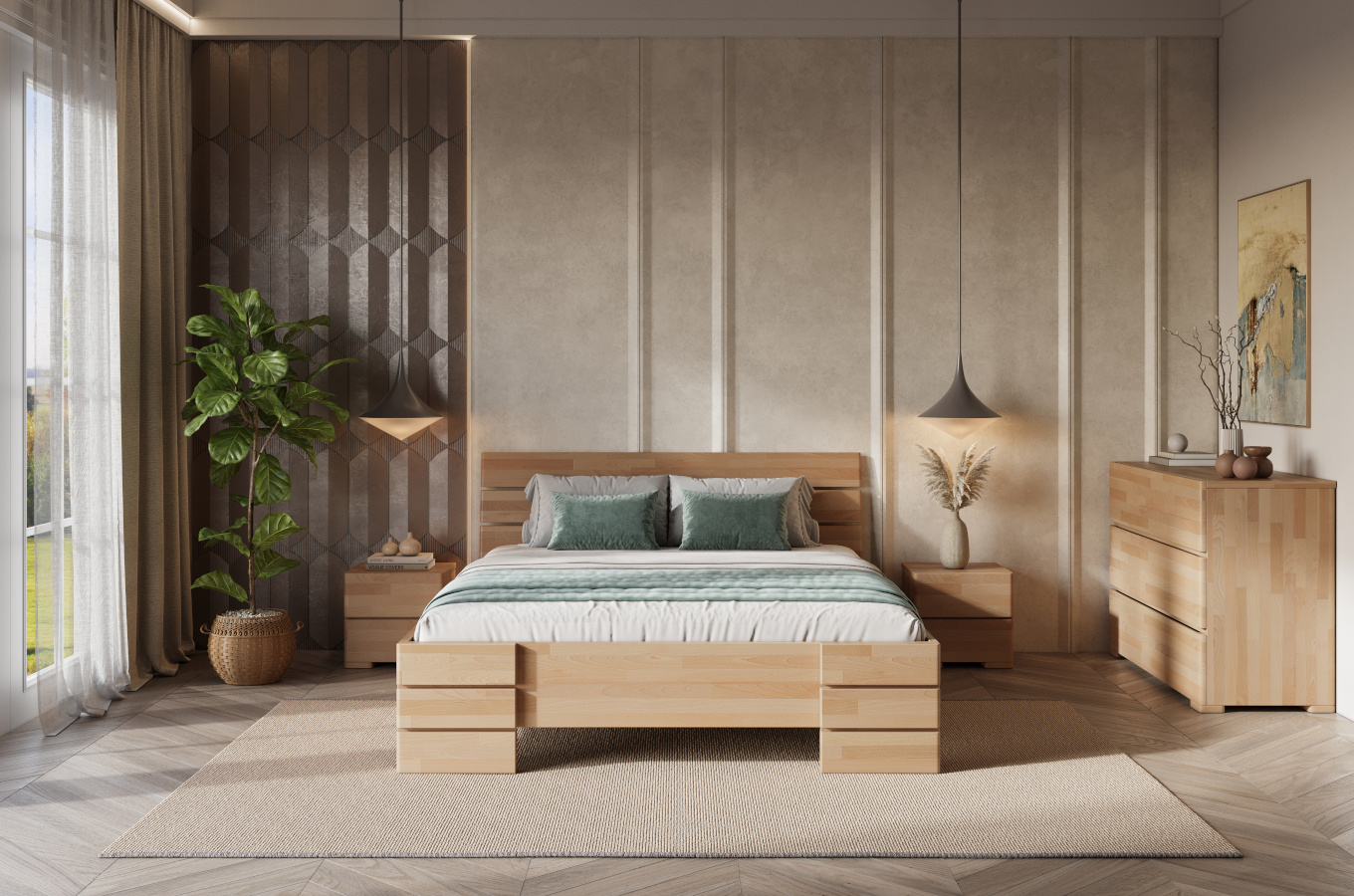Drewniane, bukowe łóżko do sypialni Visby SANDEMO High&BC&Long to ceniony i stylowy mebel, który odmieni każdą sypialnię, a ponadto zapewni wygodny i doskonały wypoczynek. Stabilność i solidne wykonanie dodatkowo podkreślają jego atuty. Dzięki podwyższonej wysokości – tym samym wyższemu ułożeniu materaca niż w standardowych łóżkach (prawie 50 cm) - łóżko SANDEMO High&BC&Long to mebel, który zdecydowanie ułatwi poranne wstawanie. Zwiększona wysokość jest również niezastąpionym sprzymierzeńcem w trosce o czystość - w strefę snu nie dostają się roztocza i zanieczyszczenia w takiej ilości, jak w przypadku niższych mebli. To jeszcze nie wszystko - dłuższa o 20 cm niż standardowa wersja sprawia, że wysokie osoby zyskały możliwość kupna mebla dopasowanego do ich wzrostu.