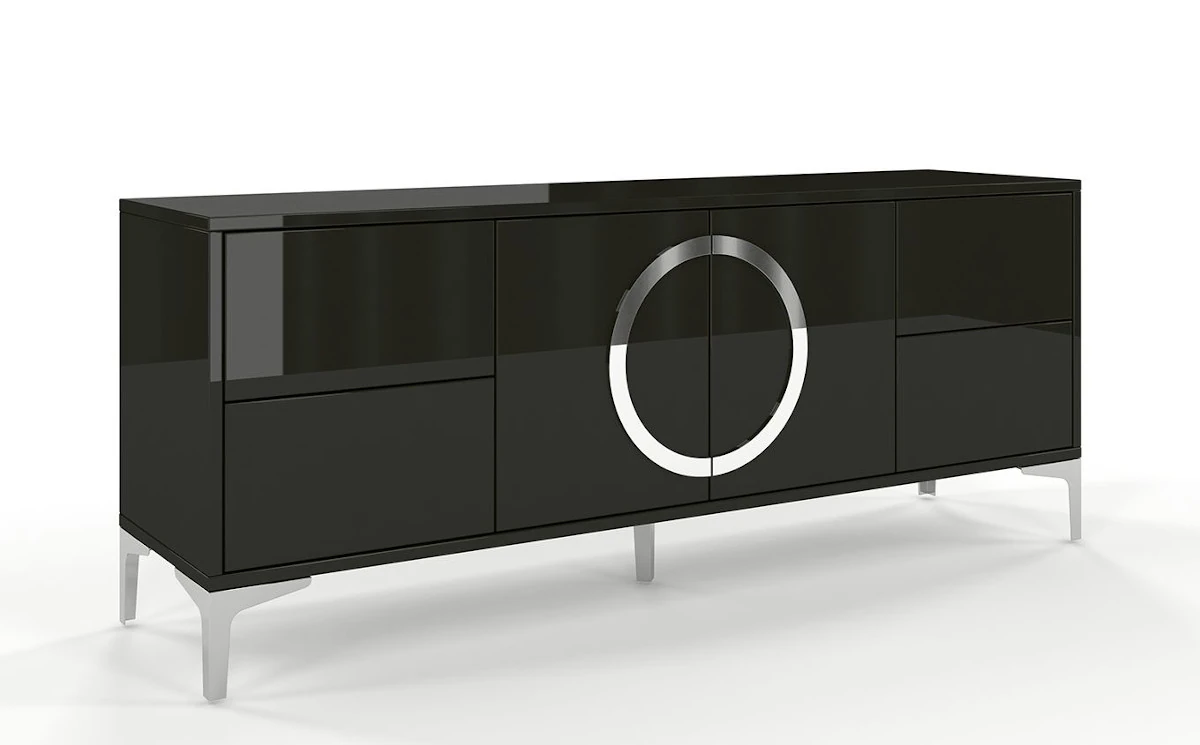 • Nowoczesna szafka RTV o dynamicznym kształcie. Efektowności nadaje jej wykończenie w połysku oraz dekoracja w postaci koła umieszczona na frontach szafki. Całość podkreślają metalowe nóżki wykonane z chromowanej stali.