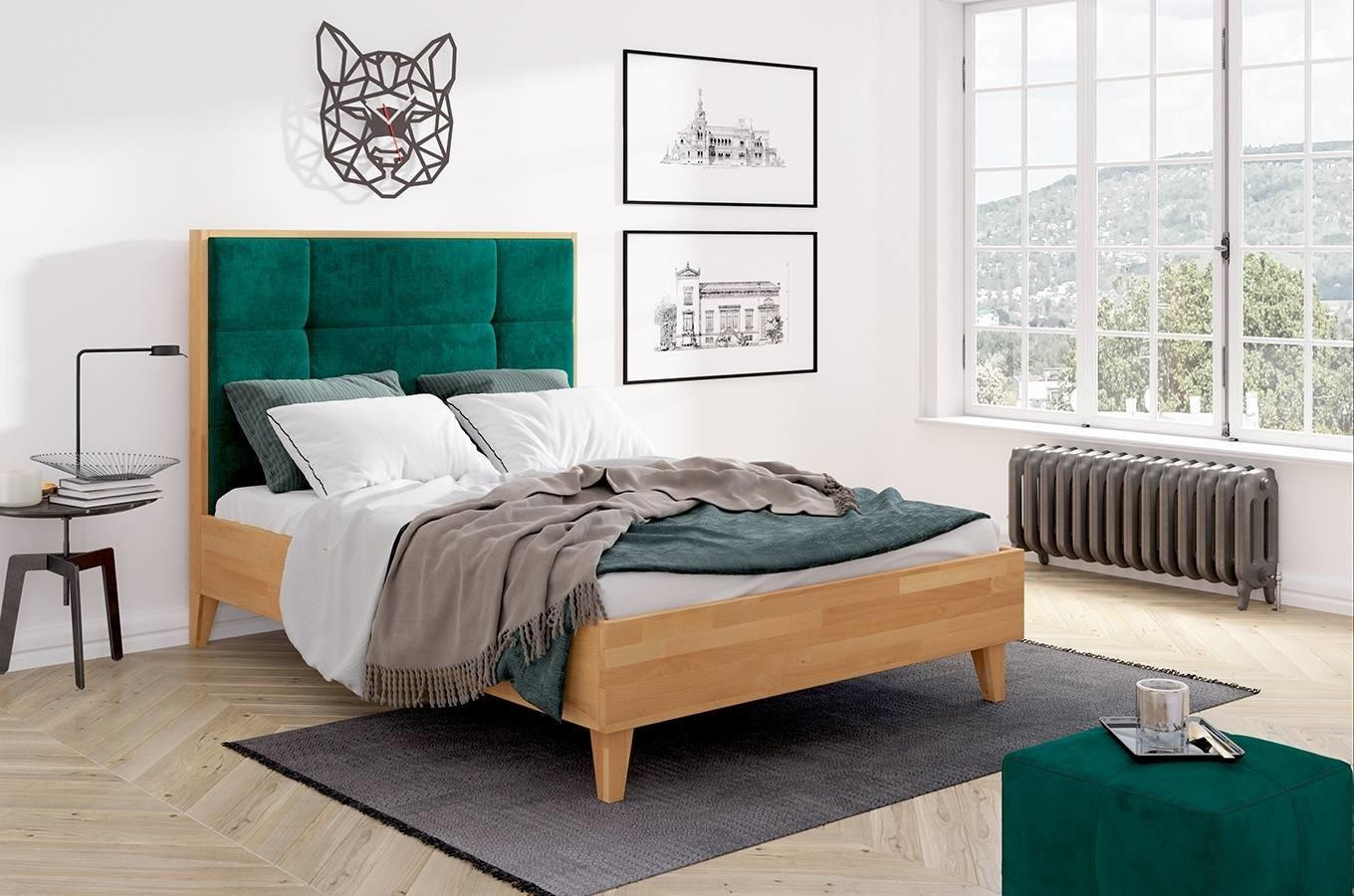 Drewniane łóżko z tapicerowanym zagłówkiem