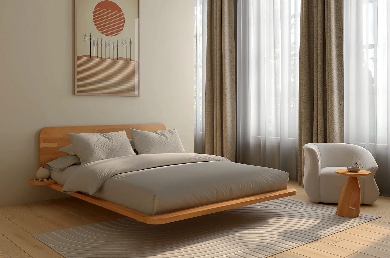 Nowoczesne łóżko drewniane w niezwykle modnym klimacie Japandi. Umiejętnie łączy powściągliwość w doborze dodatków oraz zamiłowanie do naturalnych barw i surowców.