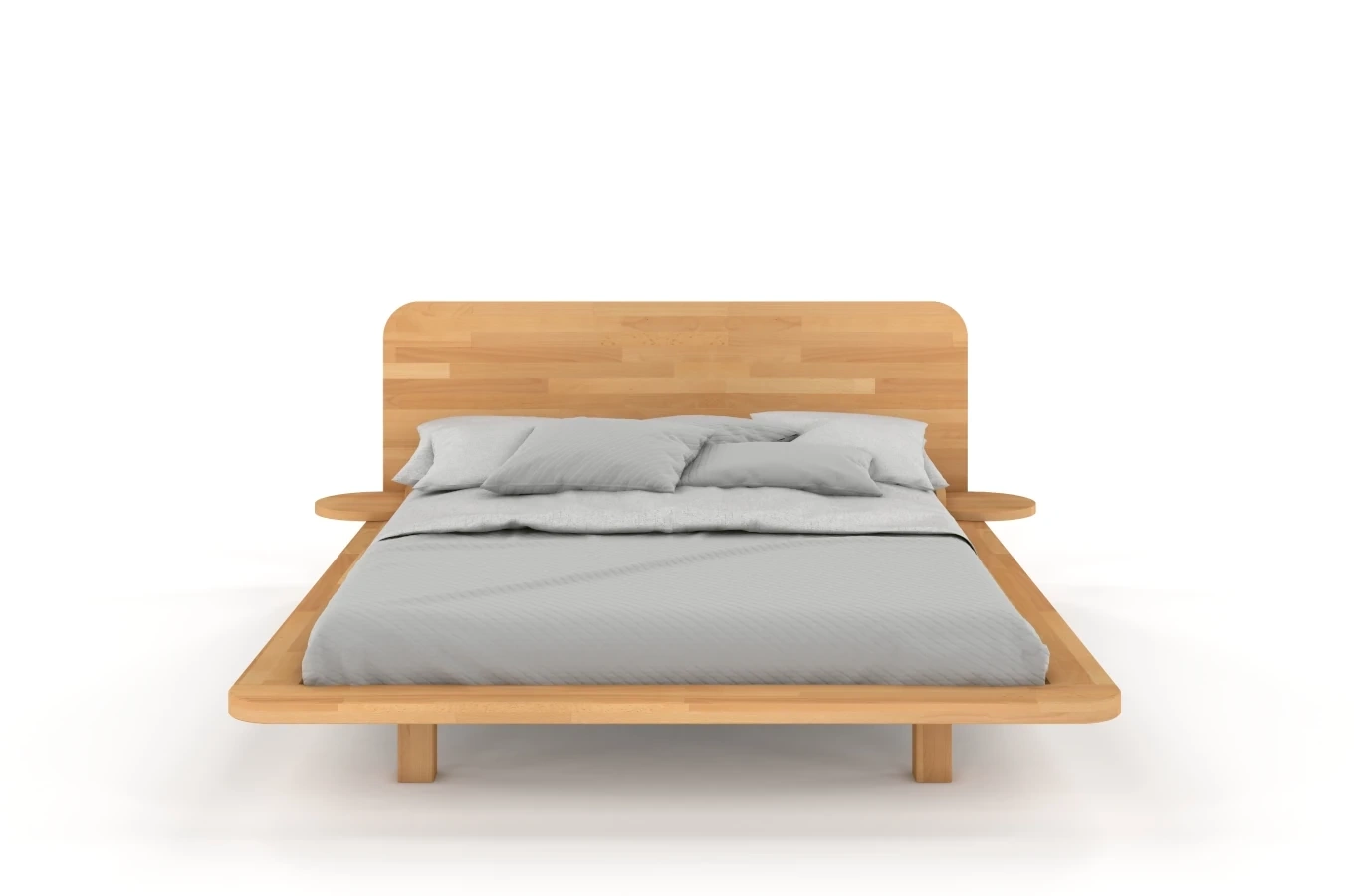 Łóżko Skandica JAPANDIC w całości wykonane zostało z pięknego i trwałego drewna bukowego w oszczędnej, a zarazem ciekawej formie. Oryginalna konstrukcja opiera się o grubą (4 cm) drewnianą ramę, która jednocześnie tworzy swego rodzaju szeroką półkę wokół materaca. Zaokrąglone krawędzie zarówno zagłówka, jak i ramy łóżka nadają bryle wizualnej lekkości, a także wpływają na bezpieczeństwo użytkowania. Rama łóżka opiera się na solidnych deskach, których fundamentem jest 6 stabilnych drewnianych nóg. Warto zauważyć, że nogi są znacznie cofnięte w stosunku do krawędzi mebla, dzięki czemu uzyskujemy efekt łóżka "lewitującego". Ponadto, mocnym atutem mebla są oparte na jego ramie stoliki nocne w postaci okrągłych półek. Stanowią one idealne miejsce na ulubioną lekturę, lampkę nocną oraz inne rzeczy przydatne w zasięgu ręki na czas snu. Opcjonalnie istnieje możliwość zamówienia prezentowanego łóżka w wersji bez stolików.