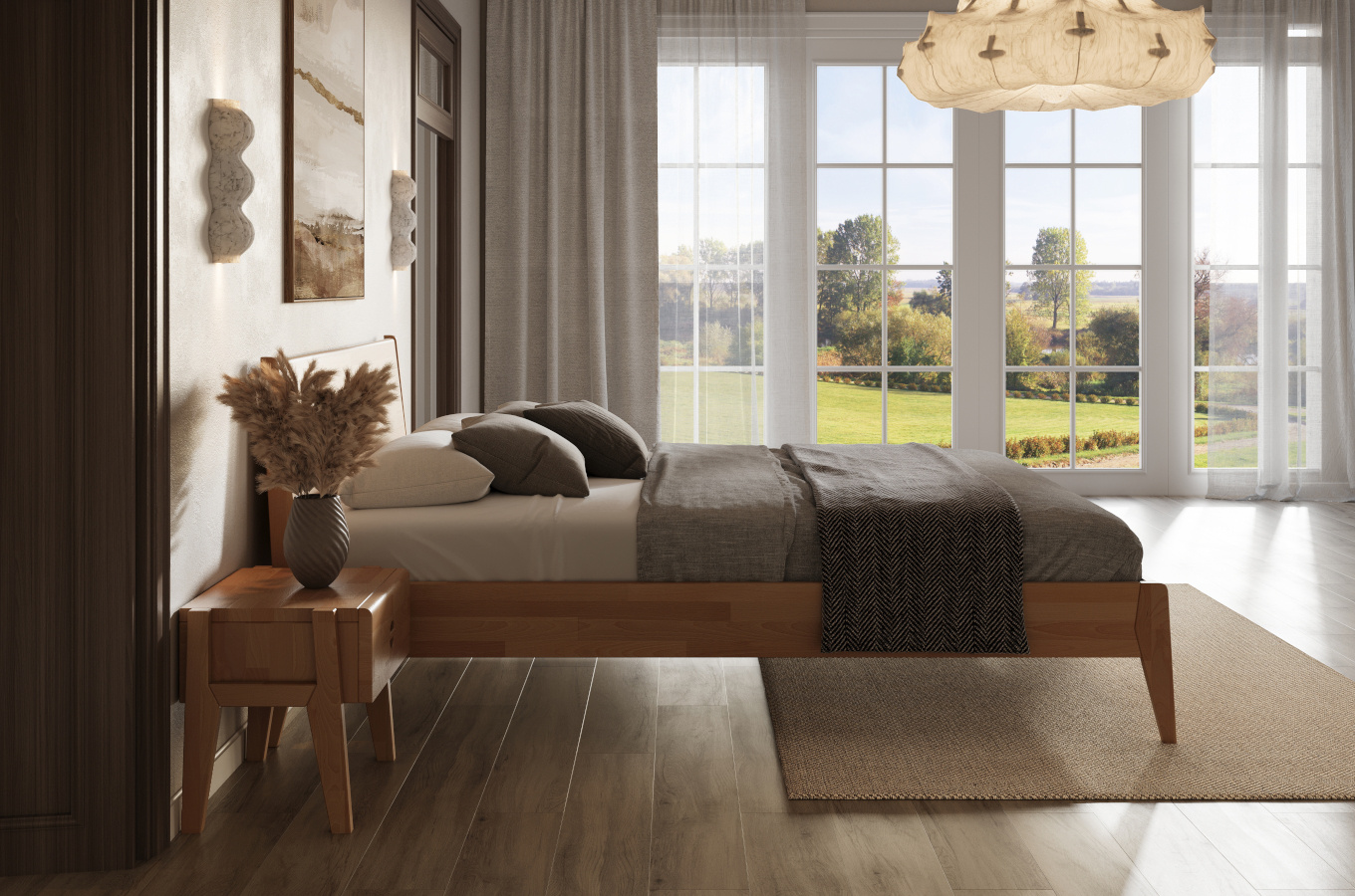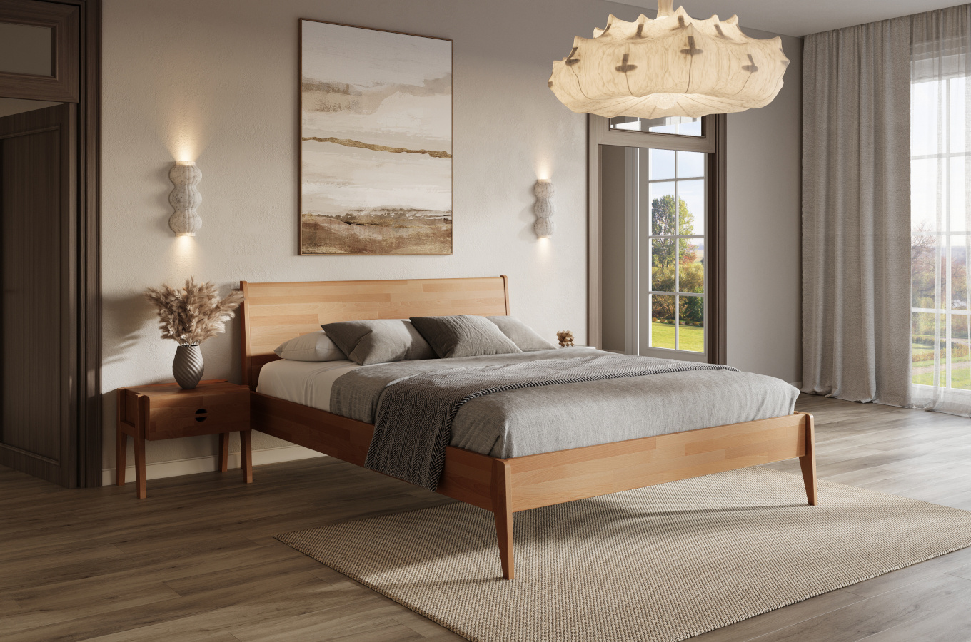 To nowoczesne, oszczędne i lekkie w formie drewniane łóżko do sypialni, które zdecydowanie wyróżnia się na tle innych, drewnianych łóżek. Posiada ono drewniany zagłówek, który w zestawieniu z podpierającymi go wspornikami, które są jednocześnie jego krawędziami, tworzy bardzo ciekawą formę. Te właściwości w zestawieniu ukośnie uciętymi nogami sprawiają, że mebel wygląda bardzo dynamicznie i na pewno spodoba się osobom lubiącym nowoczesny styl.