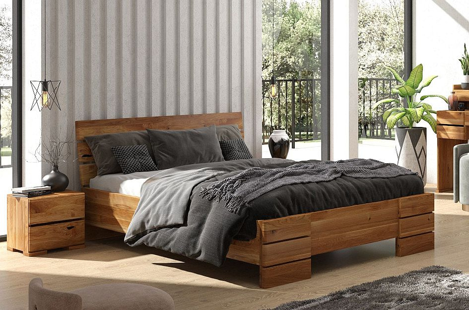 Tapicerowane łóżko drewniane dębowe Visby FRIDA z wysokim zagłówkiem