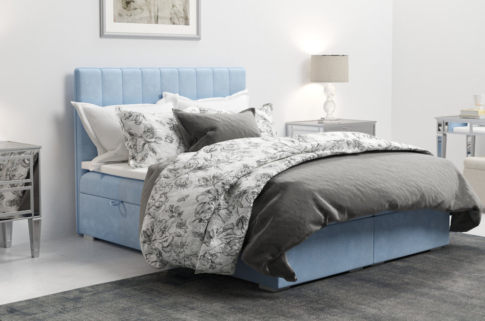 Eleganckie tapicerowane łóżko kontynentalne do sypialni AUGUST z pojemnikiem na pościel