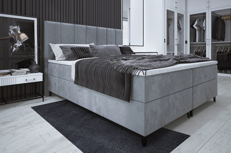 Tapicerowane łóżko kontynentalne ROMA z zagłówkiem z pionowymi przeszyciami