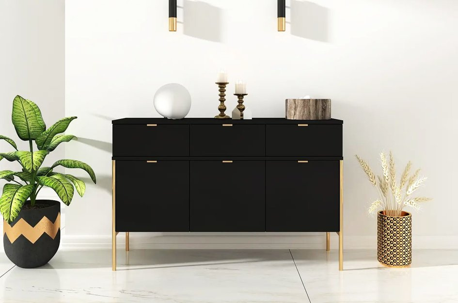 Elegancka czarna komoda do salonu Skandica POLKA na złotych nóżkach / szer. 120 cm