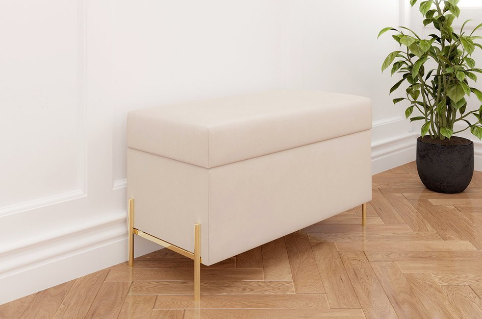 Beżowa tapicerowana ławka Dancan BORGO z pojemnikiem, na złotych metalowych nogach