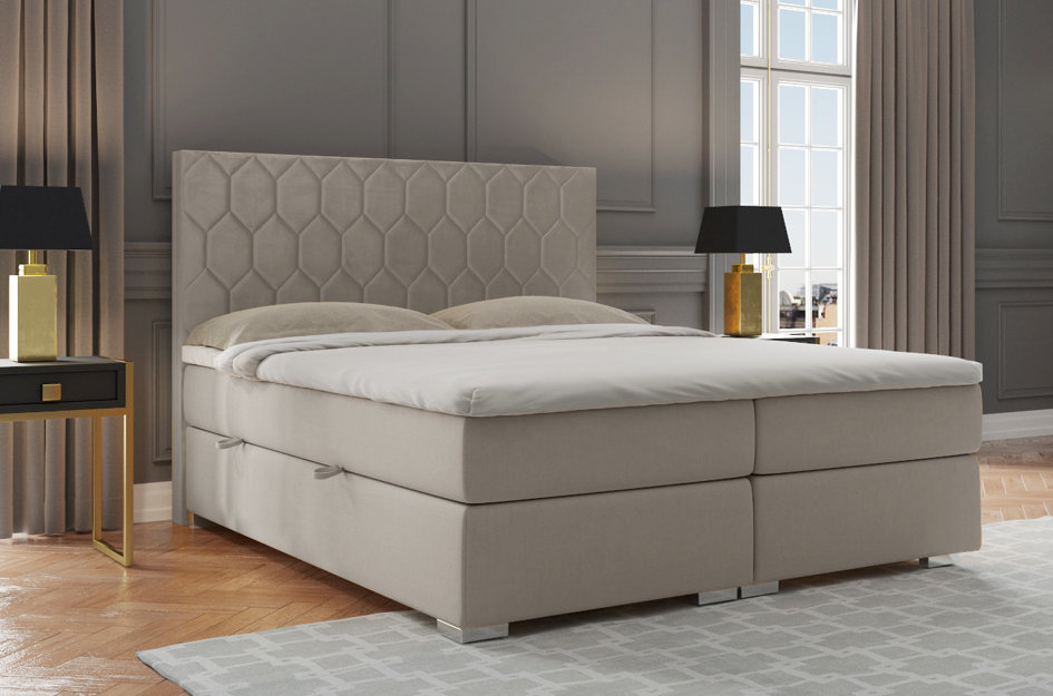 Eleganckie tapicerowane łóżko kontynentalne do sypialni MADAM z pojemnikiem na pościel