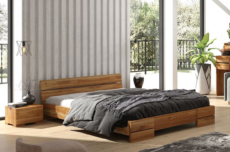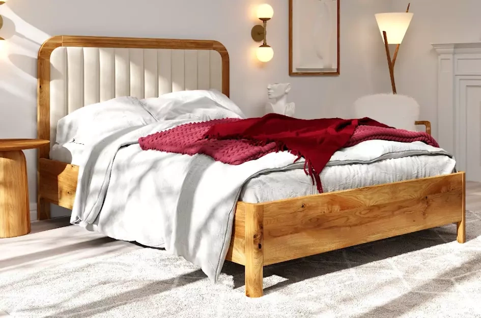Tapicerowane łóżko drewniane dębowe Visby MODENA z wysokim zagłówkiem